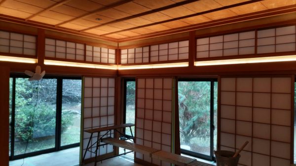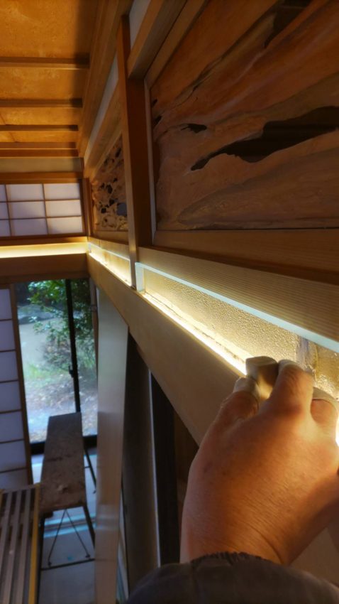 この現場も最近流行りの欄間のあい壁と長押のスキマにLEDのテープライトを仕込むことで、幻想的な和室空間を演出されてました。