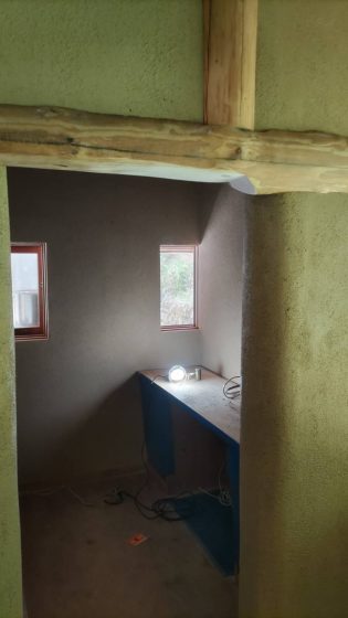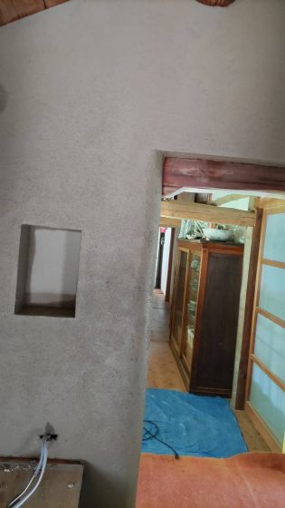 ラス板にラス網をはり、セメント中塗土で下塗りしたあとに、今回は四ミリにとおした砂と豊田の土で上塗り材料をつくり、本焼きの角ばん鏝でなでて、細かい表情をねらいました。