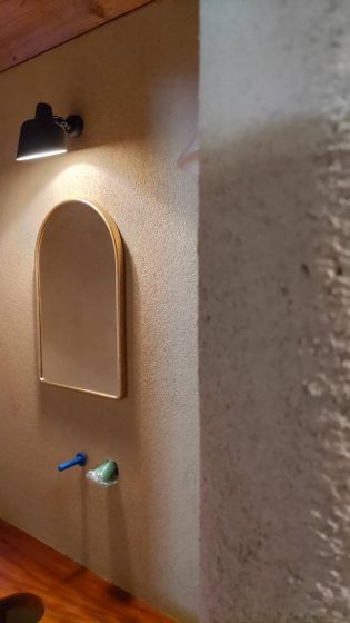 洗面所の改修工事にあたり、ぐるりの壁を土物で仕上げました。