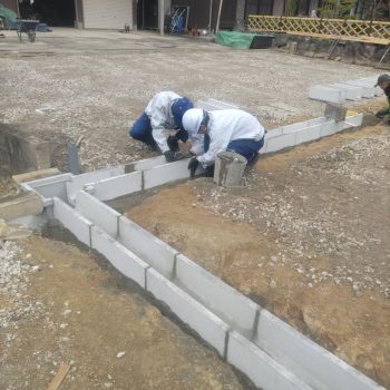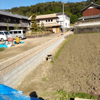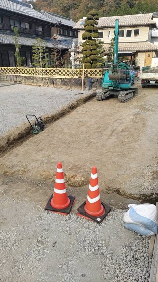 伊賀市個人様宅の庭先と進入路をコンクリート仕上げするために、下地準備を進めています。